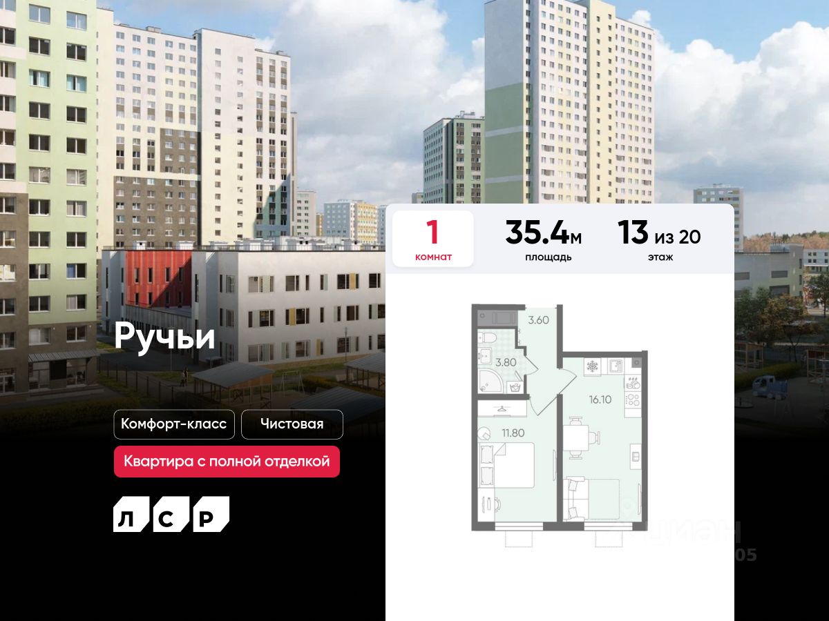 Продаётся 1-комнатная квартира в ЖК "Ручьи" на 13 этаже. Общая площадь составляет 35.40 кв. м. Квартира с чистовой отделкой. Жилой комплекс "Ручьи" располагается по адресу Санкт-Петербург, Красногвардейский.