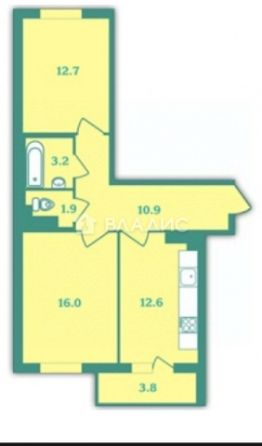 - Площадь кухни: 12,6 кв. м.