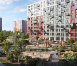 Дворы в квартале — приватные, без машин, с зелеными островками и зонами для отдыха. Вокруг школы проложен зеленый бульвар с велодорожкой. Дома высотой 11 этажей отличаются стильным фасадом в теплых оттенках с французскими балконами. В парадных — светлые лобби в европейском стиле с безбарьерной средой.