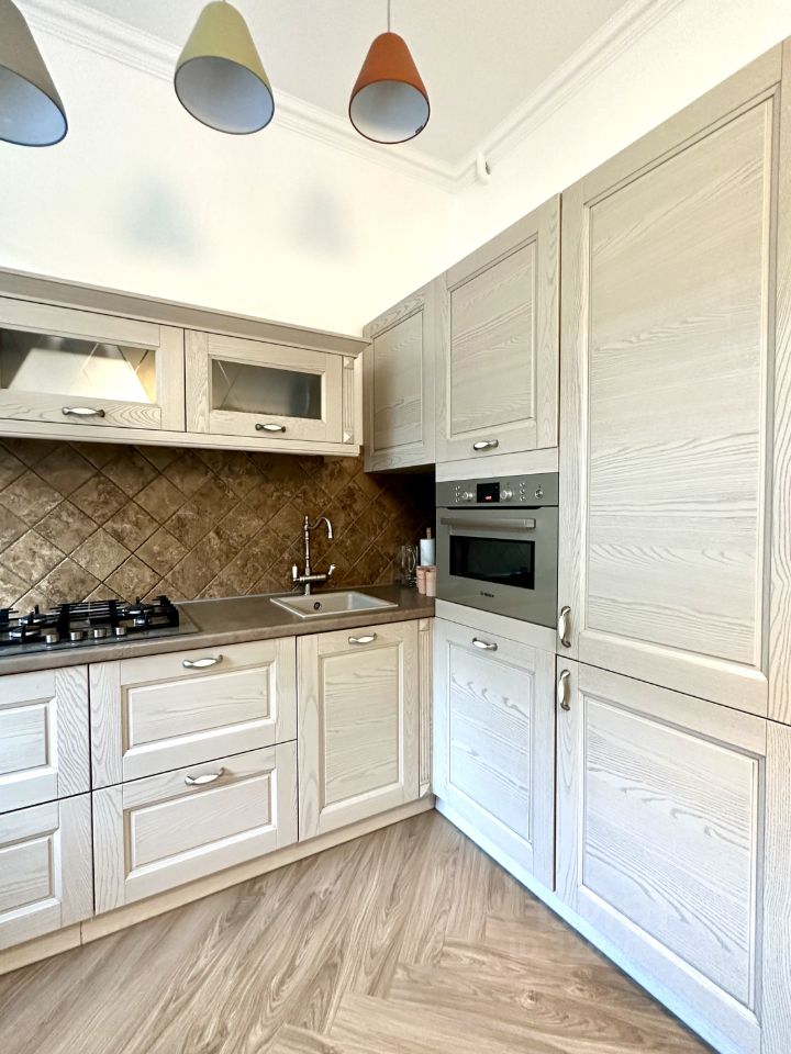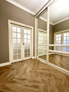 Общая площадь: 84 метра, кухня гостиная, две изолированные комнаты, просторный холл, гардеробная, совмещенный санузел, два балкона.