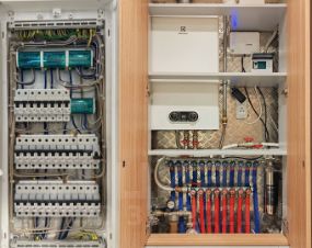 Отдельных слов уважения и восхищения заслуживает монтаж инженерных систем. В каждой комнате и в коридоре, установлены кондиционеры Toshiba. Электрооборудование Jung. Точечное и трековое освещение. Во все помещения подведена приточно-вытяжная вентиляция с подогревом.