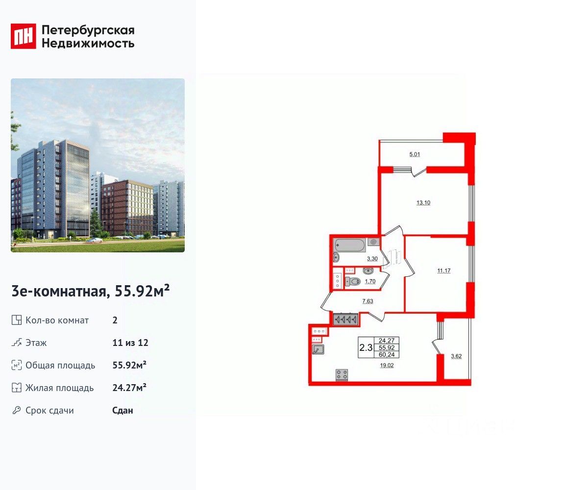 Продается уютная 2-комнатная квартира в жилом комплексе "Панорама парк Сосновка" в современном Выборгском районе. До метро можно добраться пешком всего за 15 минут. Удобная, классическая, функциональная европланировка, большая кухня-гостиная 19.02 м², вместительная прихожая 7.63 м². Общая площадь квартиры - 55.92 м², жилая 24.27 м², высота потолка 2.77 м. Квартира продается с отделкой "NORD LINE WHITE". Что особенного в ЖК "Панорама парк Сосновка"? • Престижная часть Выборгского района рядом с двумя парками (парк Сосновка и Удельный парк) • Видовые квартиры на парк • Свой сквер с арт-пространством и пешеходной аллеей (протяженностью 1000 м) • Собственные д/с и школа со стадионом, а также детский клуб для игр и проведения праздников • Семейные секции со спуском лифта в паркинг