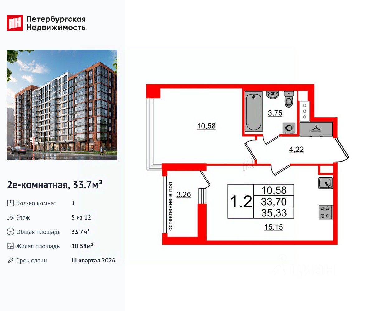 Удобная, классическая, функциональная европланировка, большая кухня-гостиная 15.15 м², просторная прихожая 4.22 м². Общая площадь квартиры - 33.7 м², жилая 10.58 м², высота потолка 2.77 м.
