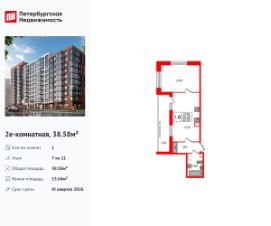 Удобная, классическая, функциональная европланировка, большая кухня-гостиная 17.05 м², вместительная прихожая 3.81 м². Общая площадь квартиры - 38.58 м², жилая 13.64 м², высота потолка 2.77 м.