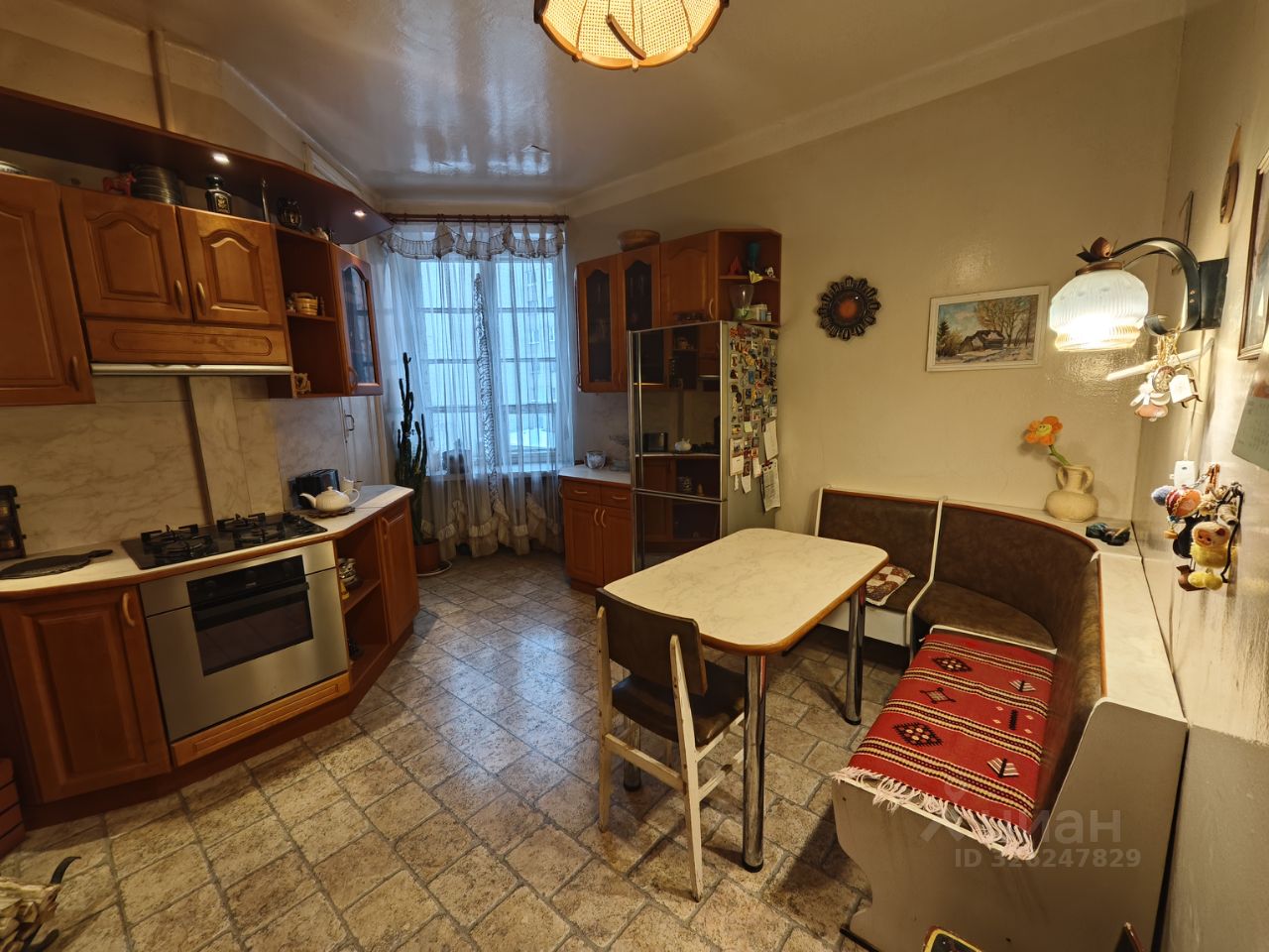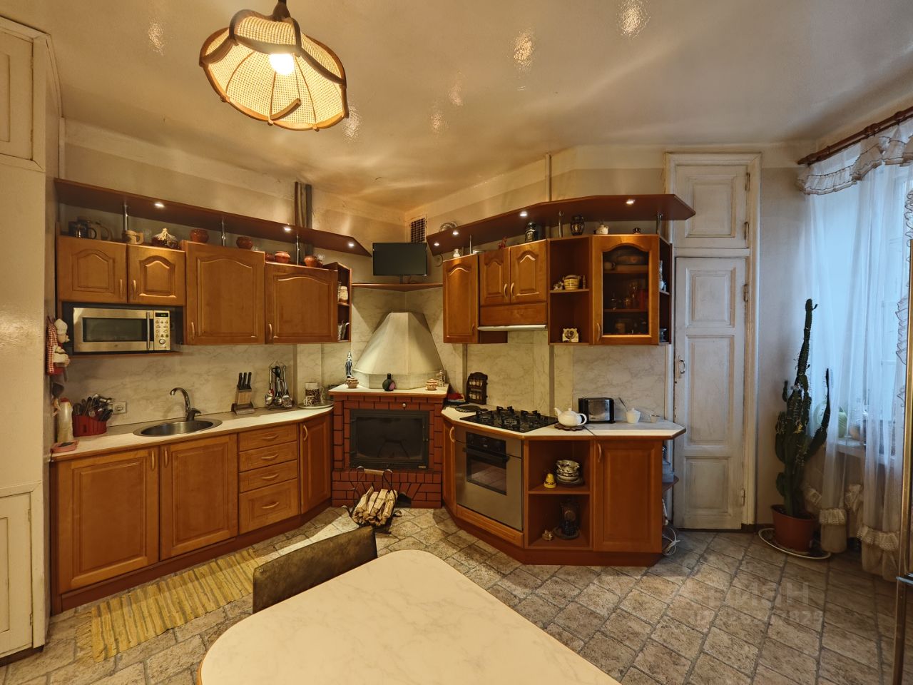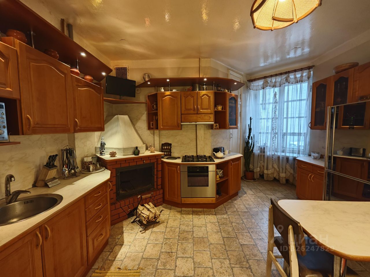 Кухня площадью 21,54 кв.м. с видом в тихий двор. При кухне имеется кабинет с вместительным встроенным шкафом. Кухня имеет оригинальную форму. Согласно финским традициям строительства на кухне есть большой встроенный холодный шкаф и действующий дровяной камин. Кухня оборудована качественным кухонным гарнитуром и современной бытовой техникой. Половое покрытие на кухне ламинат.