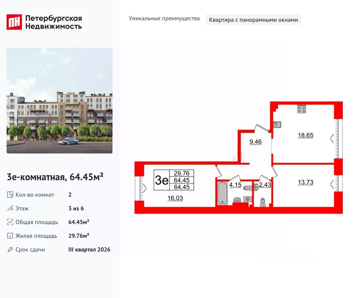 Уникальная, функциональная европланировка, большая кухня-гостиная 18.65 м², просторная прихожая 9.46 м². Общая площадь квартиры - 64.45 м², жилая 29.76 м², высота потолка 3 м.
