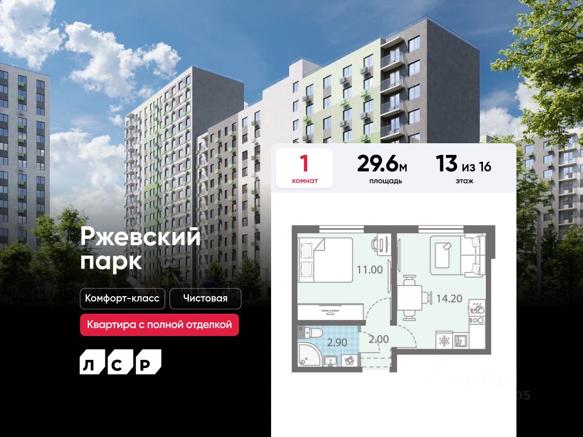 Продается 1-комнатная квартира в ЖК "ЛСР. Ржевский парк" на 13 этаже. Общая площадь составляет 29.60 кв. м. Квартира с чистовой отделкой. Жилой комплекс "ЛСР. Ржевский парк" располагается по адресу Ленинградская область, Всеволожский район, Ковалёво пос..