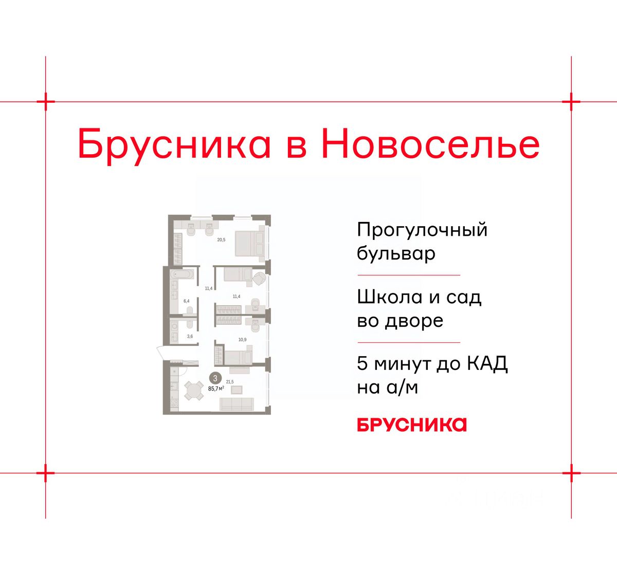 Трехкомнатная квартира с предчистовой отделкой в ЖК "Брусника в Новоселье" на 1 этаже. Общая площадь: 85.72 кв.м., жилая: 42.8 кв.м., площадь просторной кухни-столовой: 21.5 кв.м. Квартира угловая, очень светлая, естественная вентиляция при открытии окон. В квартире один совмещенный и один раздельный санузел. Высота потолков 2.7 м.