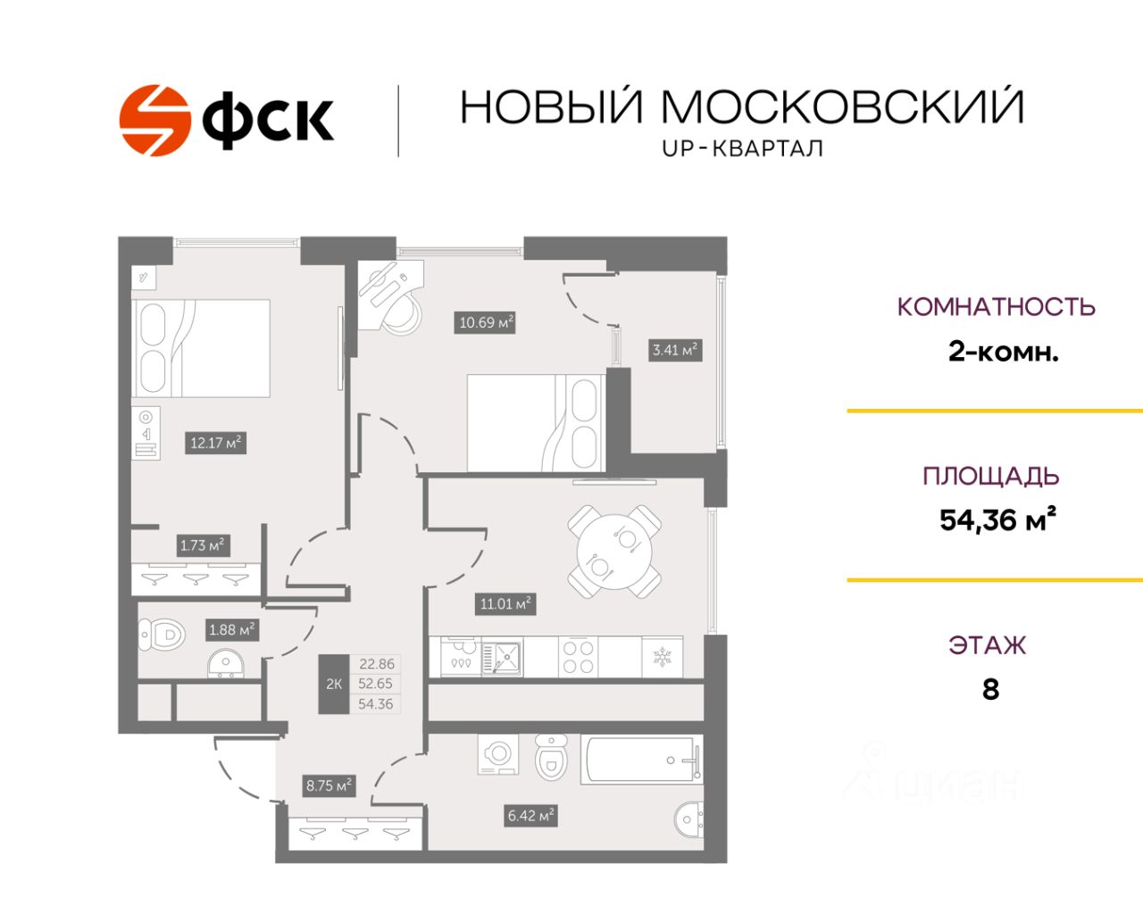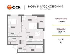 Прямая продажа от застройщика. Беспроцентная рассрочка. 2-к квартира в ЖК Up-квартал "Новый Московский" на 8-м этаже. Общая площадь 54,3. Без отделки.