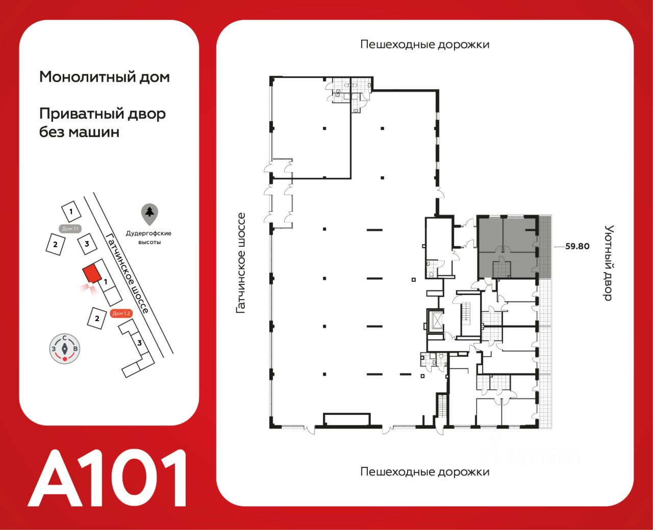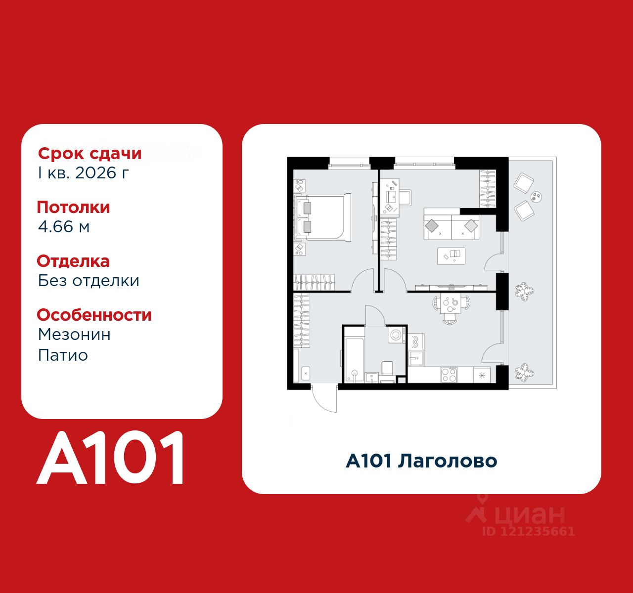 2-комнатная квартира площадью 59.80 в ЖК "А101 Лаголово" на 1 этаже. Квартира без отделки. Вид из окна во двор. В квартире 1 санузел. Высота потолков 4.66 м. Особенность планировки - мезонин и патио.