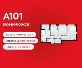 3-комнатная квартира площадью 67.10 в ЖК "А101 Всеволожск" c лоджией на 3 этаже. Квартира с отделкой. Вид из окна во двор. В квартире 2 санузла. Высота потолков 2.8 м. Особенность планировки - гардеробная, мастер-спальня.