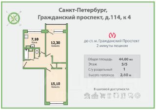 Квартира находится всего в 2 минутах ходьбы от станции метро Гражданский проспект, что делает её доступной для жителей Санкт-Петербурга.