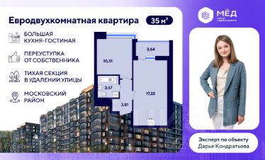 - Общая плoщадь - 35,64 кв.м + лоджия 3,64