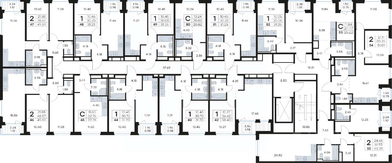 Продается 2-комн. квартира на 4-м этаже в строящемся проекте комфорт-класса GloraX Новоселье. Общая площадь лота составляет 49,69 кв. м, из которых 21,88 кв. м отведено под жилую и 15,56 кв. м под кухонную зону. Номер квартиры - 47