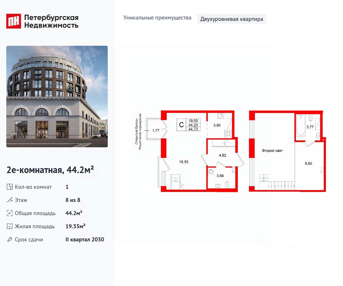 Уникальная, функциональная европланировка, просторная прихожая 4.82 м². Общая площадь квартиры - 44.2 м², жилая 19.55 м².