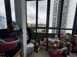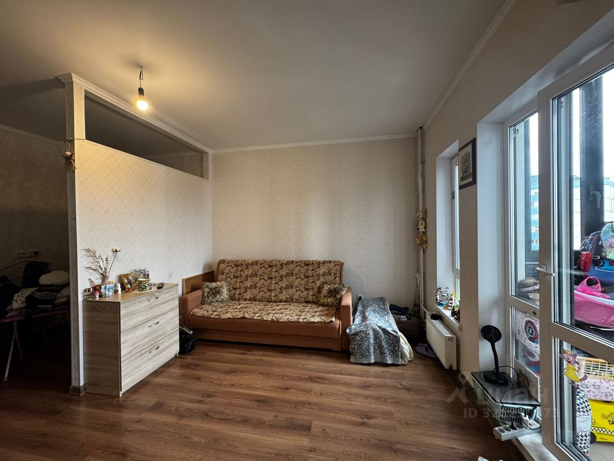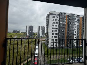В студии выделена кухонная зона. Увеличенные по высоте окна. Большой застекленный балкон. Совмещенный сан.узел с полноценной ванной.
