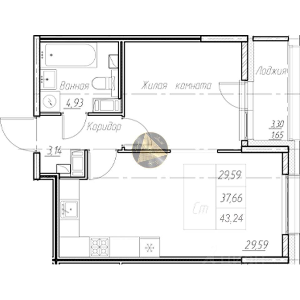 - Общая площадь квартиры 43.24 м2