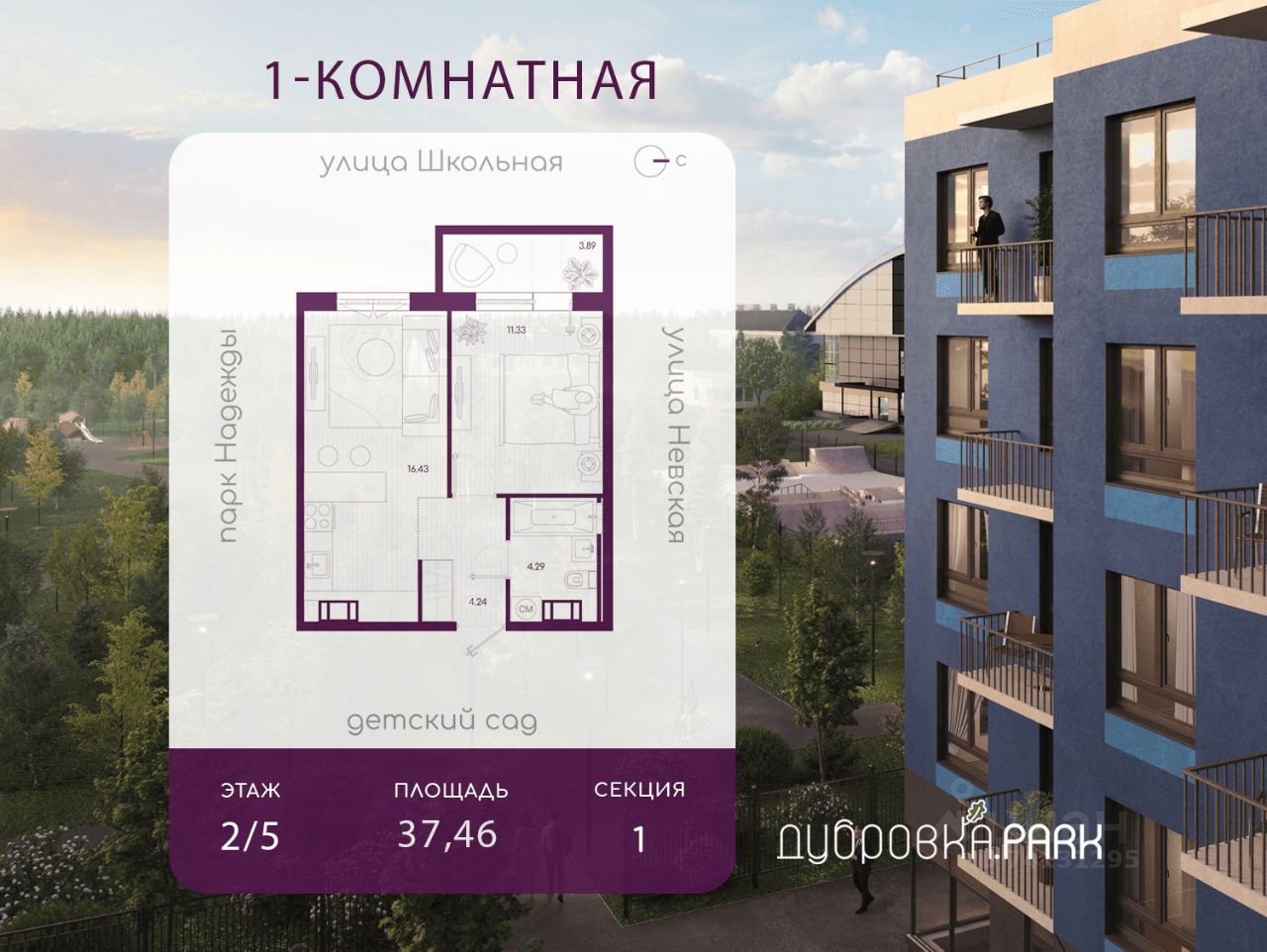 Квартира располагается на 2 этаже 5-этажного дома в ЖК Дубровка.Park.