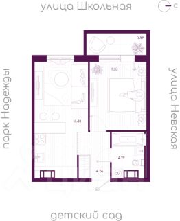 Жилая площадь 11.33 м2, кухня 16.43 м2, балконов - 1, окна выходят на улицу.