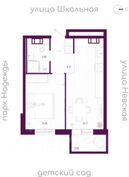 Жилая площадь 11.36 м2, кухня 15.71 м2, балконов - 1, окна выходят во двор.