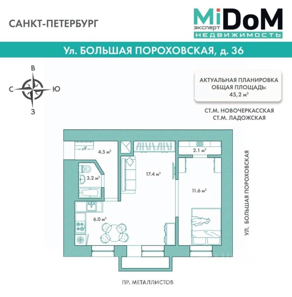 Арт. 91336108. МИДОМ.ЭКСПЕРТ.НЕДВИЖИМОСТЬ предлагает к продаже: Светлую, уютную двухкомнатную квартиру площадью 45,2 м. с качественным ремонтом по адресу: Большая Пороховская улица, в Красногвардейском районе с развитой инфраструктурой. Доступен ОНЛАЙН ПОКАЗ по видеосвязи, а также отправим Вам видеоролик по запросу. ЗВОНИТЕ! ЛЕГКО КУПИТЬ: - Один взрослый собственник - Без обременений и долгов -Квартира от АН "Мидом". Гарантирована юридическая безопасность О КВАРТИРЕ И ДОМЕ: - Квартира расположена на 2 этаже 5-ти этажного дома. - Тихий район рядом с парком - Окна кухни и две комнаты выходят на тихий двор. Комфортная планировка: просторная прихожая. Совмещенный санузел с инсталяцией, установлена система теплого пола, полотенцесушитель от ГВС. Просторная кухня-гостиная 23 м, комната 12 м, высота потолка 2,65 м. Функциональная кухня объединена с гостиной. Такой Дизайн-решение дает только плюсы: расширение пространства, наполнение его светом, создает комфортную, уютную атмосферу для всей семьи. Во всей квартире сделан качественный ремонт. Пол: цементная стяжка, применялась система KNAUF супер пол. Коридор, санузел, кухня покрыты керамической плиткой, в комнатах лежит ламинат. Поменяна вся электропроводка, вся сантехника, включая разводку и стояки. Дом 1964 года. Серия дома 1-507, отличительный проект от других серий широкими подоконниками организация дополнительного места хранения. Зимой тепло, летом не жарко. Вход в парадную оборудован домофоном и оснащен видеонаблюдением. Чистая парадная, дружелюбные соседи. Управляющая компания УК 2, отличное качество работы и оказываемых услуг. ДОКУМЕНТЫ: Один взрослый собственник, альтернативная продажа. Полная стоимость в договоре. Без обременений, материнский капитал не использовали. Быстрый выход на сделку. ТРАНСПОРТ: До станции метро "Новочеркасская", "Ладожская" налажено отличное транспортное сообщение, можно доехать за 6-8 минут. До исторического центра города на машине можно доехать за 10 мин. Выезд на КАД займет 15 минут. Всегда можно найти место для парковки машины. ИНФРАСТРУКТУРА: Рядом с домом СОШ 532, садик 33. Район утопает в зелени, большое количество детских площадок. В пешей доступности находится Зона отдыха Полюстровский парк с современным освещением, прекрасное место для прогулок с детьми, занятия спортом и просто насладиться прекрасными видами и свежим воздухом. Для шоппинга и отдыха ТЦ "Охта Молл", Рестораны, Супермаркеты, Аптеки, Поликлиники, Школы, Спортклубы с бассейном, кафе, пекарни, пункты ремонта и доставки. Звоните! С удовольствием покажем Вам квартиру!