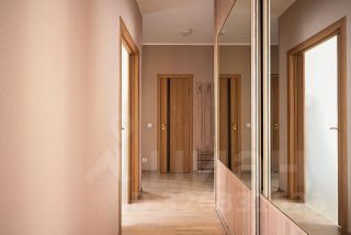 Прихожая с большим зеркальным шкафом для хранения.