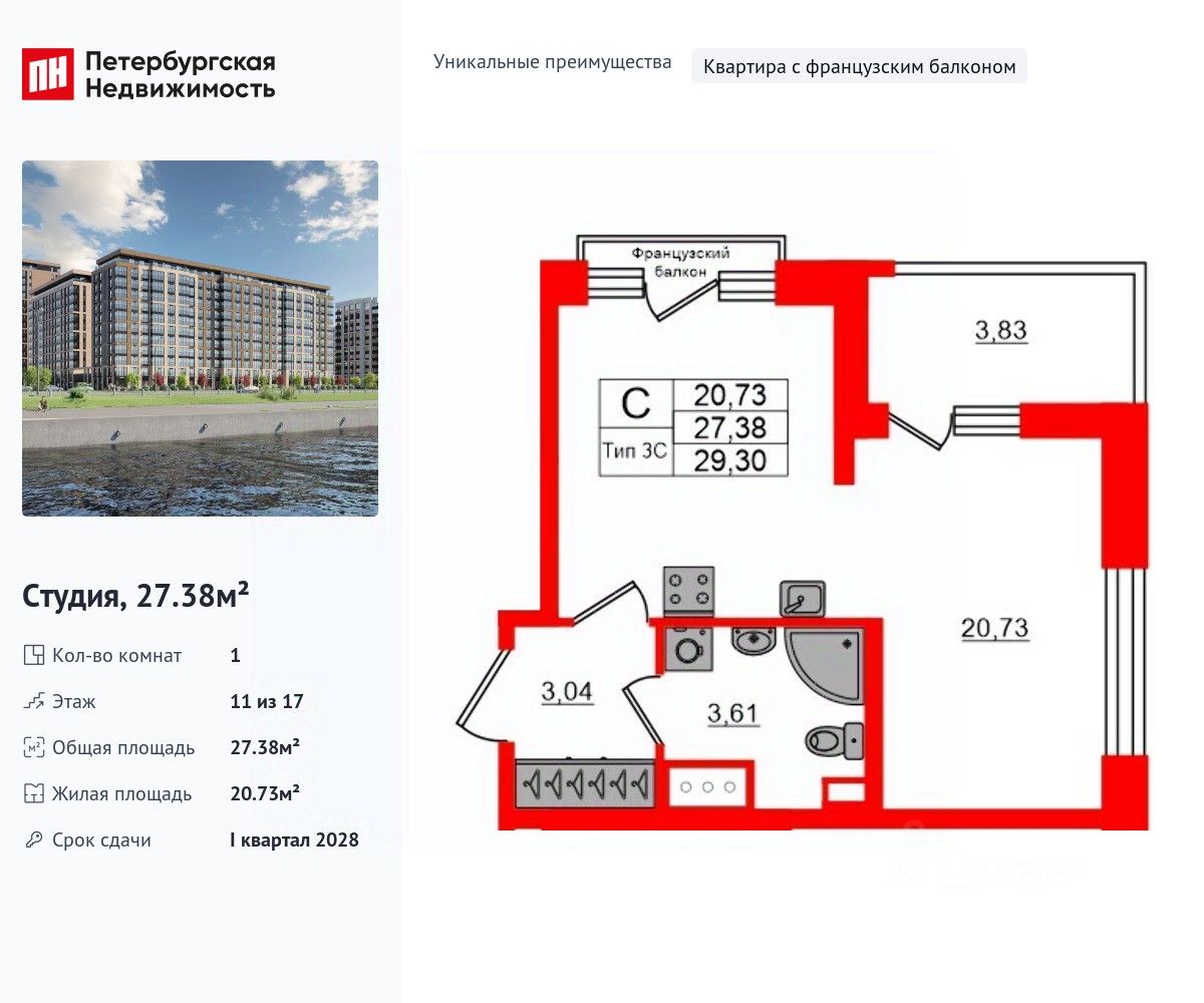 Уникальная, функциональная европланировка, вместительная прихожая 3.04 м². Общая площадь студии - 27.38 м², жилая 20.73 м², высота потолка 2.77 м.