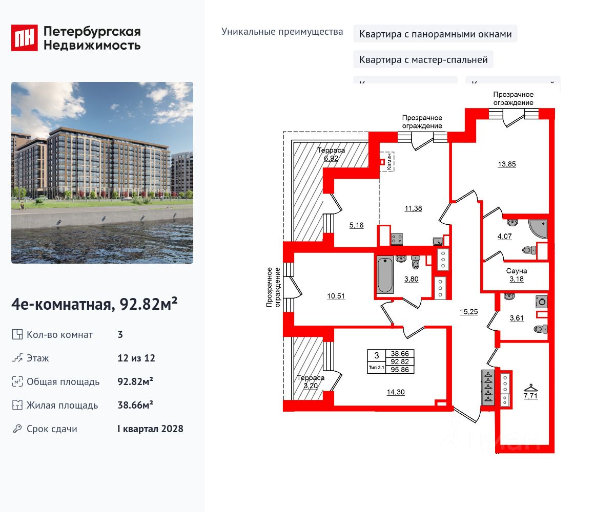 Уникальная, функциональная европланировка, большая кухня-гостиная 11.38 м², просторная прихожая 15.25 м². Общая площадь квартиры - 92.82 м², жилая 38.66 м², высота потолка 3.04 м.