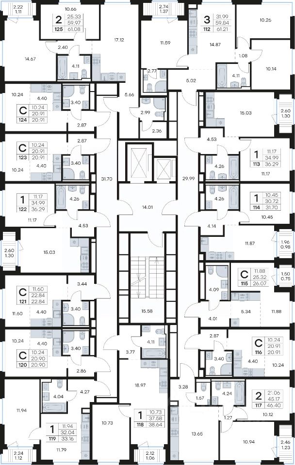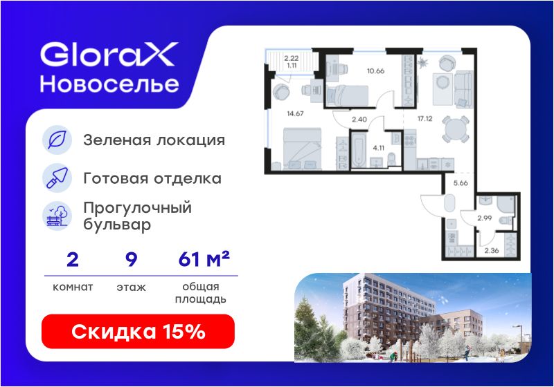 Продается 2-комн. квартира на 9-м этаже в строящемся проекте комфорт-класса GloraX Новоселье. Общая площадь лота составляет 61,08 кв. м, из которых 25,33 кв. м отведено под жилую и 17,12 кв. м под кухонную зону. Номер квартиры - 125
