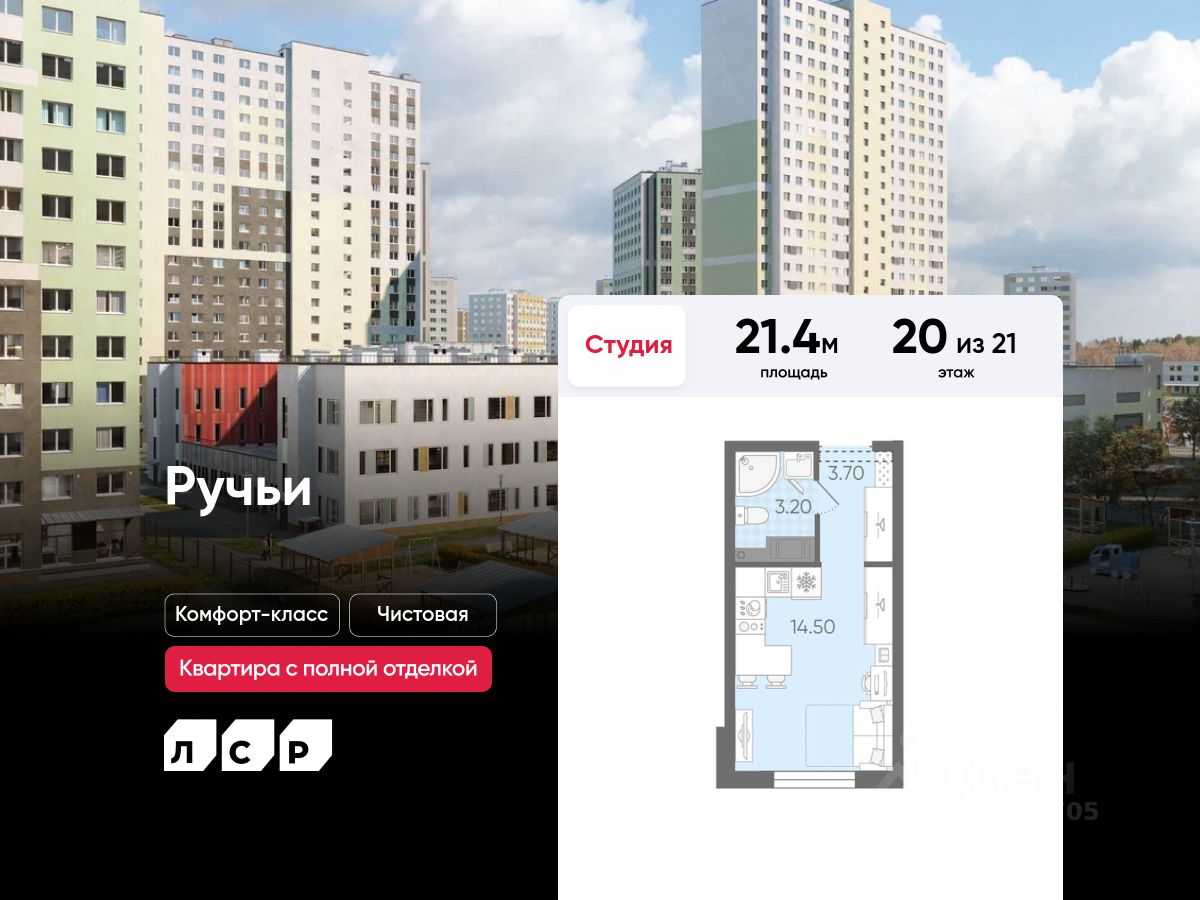 Продаётся студия в ЖК "Ручьи" на 20 этаже. Общая площадь составляет 21.40 кв. м. Квартира с чистовой отделкой. Жилой комплекс "Ручьи" располагается по адресу Санкт-Петербург, Красногвардейский.