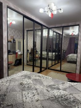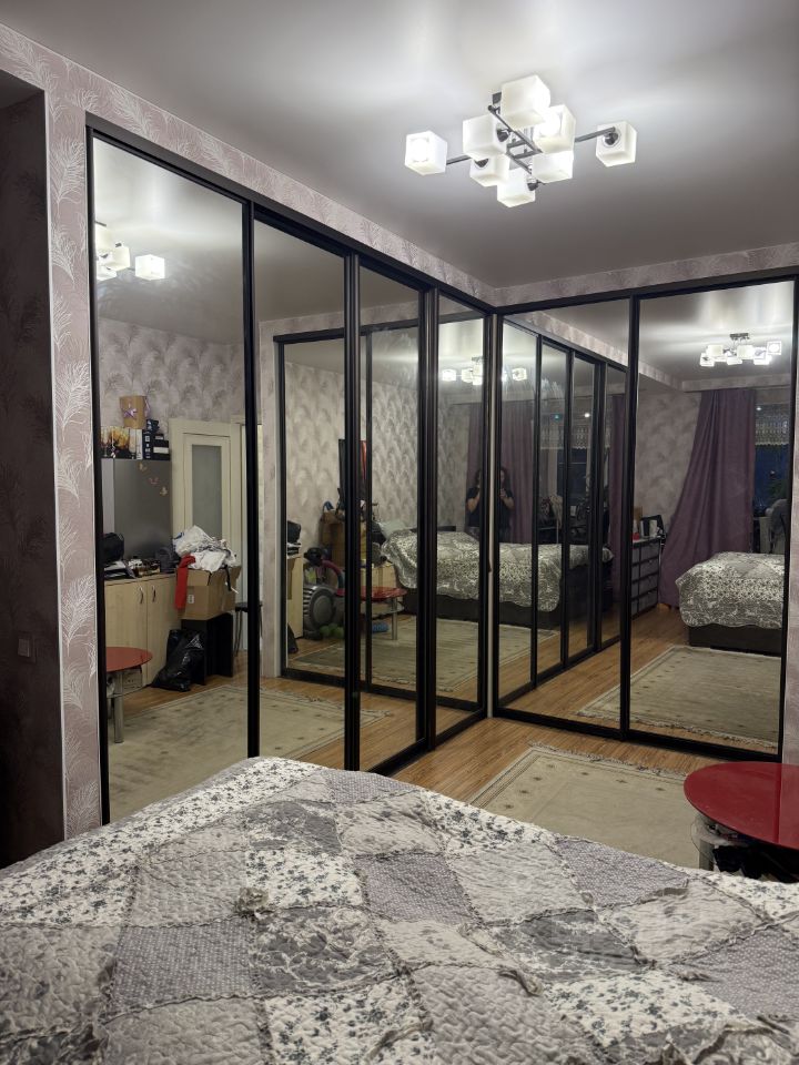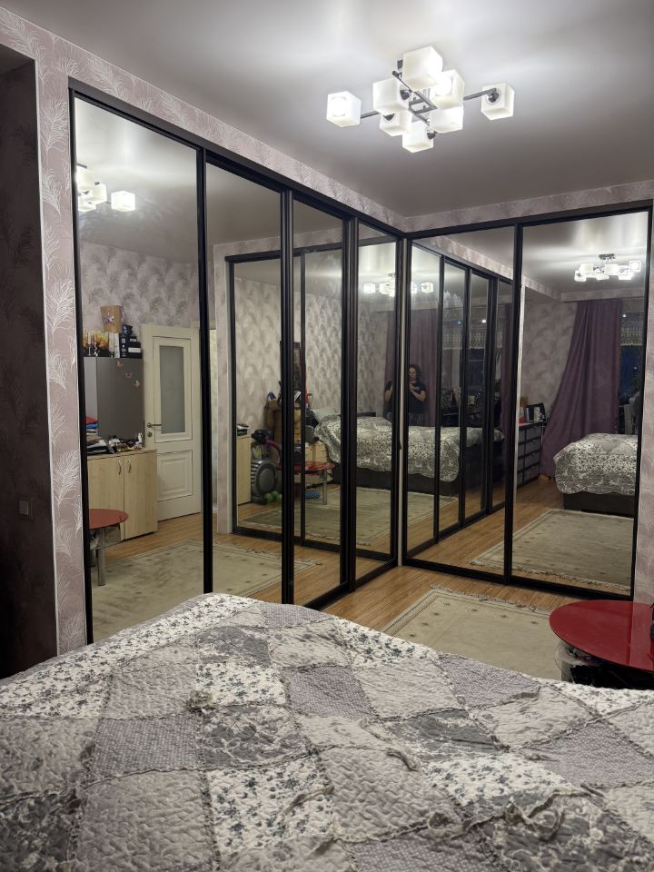 -в большой комнате установлен вместительный угловой шкаф-купе длиной более 7 метров с зеркальными дверями. Он решает вопрос хранения для всей семьи, а зеркала визуально расширяют пространство и добавляют света.