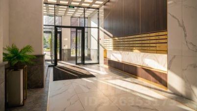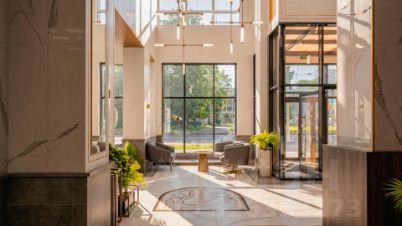 Вас встретит впечатляющая центральная входная группа с высотой потолков 6,5 метров, выполненная в стиле классической резиденции: керамогранит под итальянский мрамор, стены под латунь и витражное остекление. Здесь же — арт-пространство со стелой и садом камней.