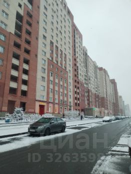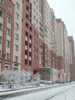 Вдоль дома со стороны Комендантского проспекта есть зона отчуждения: большой карман где всегда есть места для парковки, и зона прогулочная с зелеными насаждениями.