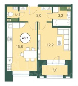 Отличная планировка: просторная кухня-гостиная 15.8 м², изолированная спальня 12.2 м², раздельный санузел.