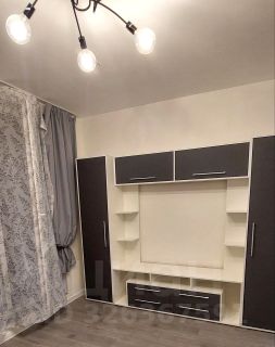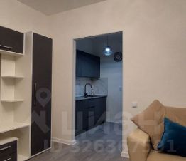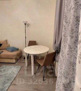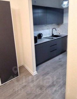 Студия достаточно большая, правильной формы, с выделенной зоной кухни отдельно от комнаты.