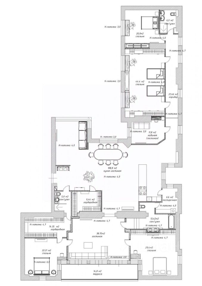 Высота потолков: 3,04,7 м. Панорамные окна на три стороны с видами на Петербург.