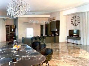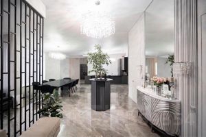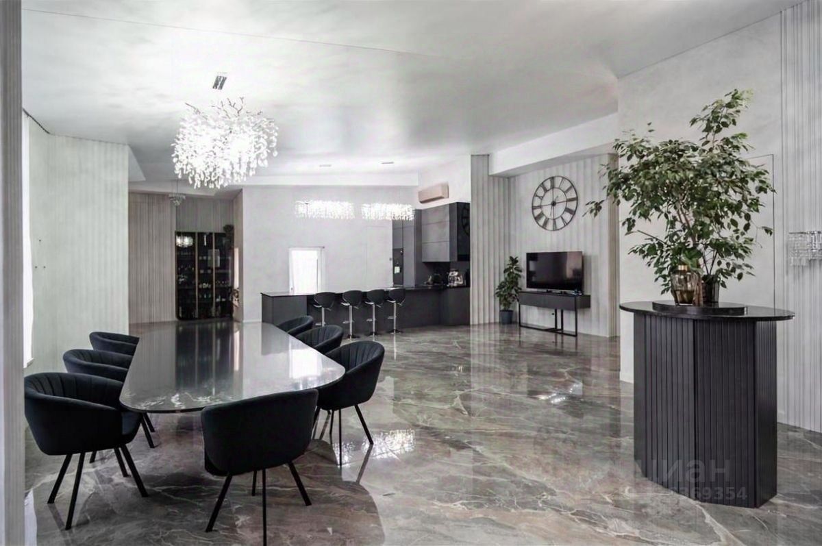 Кухонная зона с каменной столешницей, островом, полностью оборудована техникой. Обеденный стол 3,2 м с каменной столешницей.
