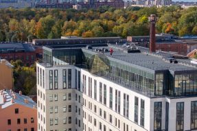 - На территории комплекса спроектировано торгово-офисное пространство с зонами коворкинга и выходом на крышу, а также концептуальный ресторан на 1 этаже.