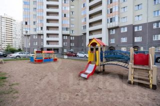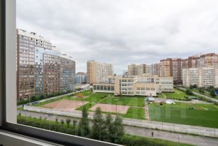 Большой балкон (4 кв. м.) НЕ входит в указанную площадь квартиры!) Вид с балкона на тихий двор, где нет шума широких улиц и множества автомобилей. Приятный вид на территорию школы и на заднем плане Лахта центр и флагштоки в парке 300-летия.