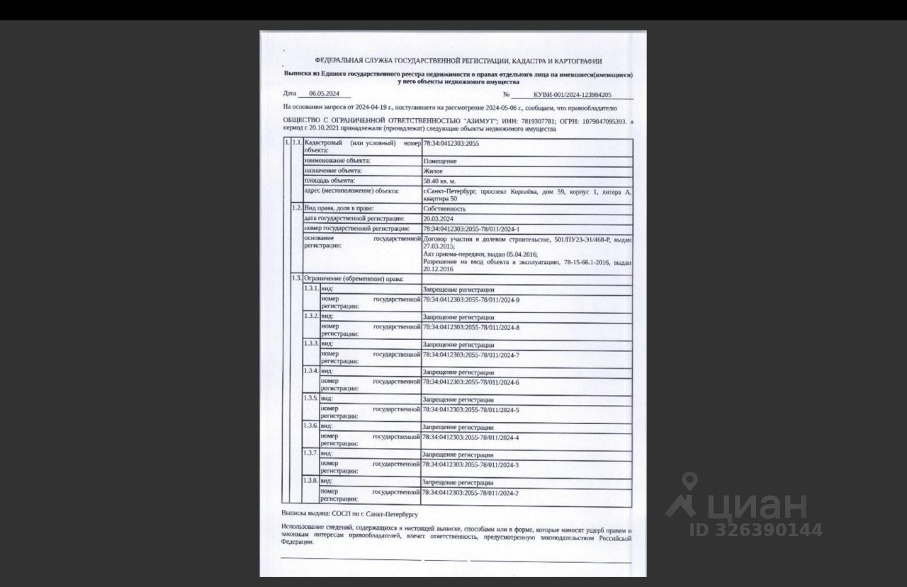 Лот1: Подвергнутое аресту СОСП ГМУ по и/п 132336/21/98078-СД и принадлежащее должнику ООО "Азимут", арестованное имущество: квартира общ.пл. 58,4 кв.м., кадастровый 78:34:0412303:2055, расположенная по адресу: г. Санкт-Петербург, ул. пр. Королева, д. 59, корп. 1, Литера А, кв. 50. Обременение: Арест, запрет регистрационных действий. Форма 7 и 9 от 08.09.2025, в квартире нет зарегистрированных лиц. Сведения о задолженности по взносам на капитальный ремонт ФССП не предоставлены.