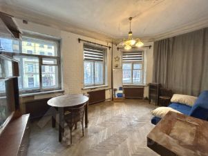 - Высокие потолки - 3,15 м. Комната угловая с видом на Малый проспект. В комнате 5 окон. Комната разделена перегородкой на части.