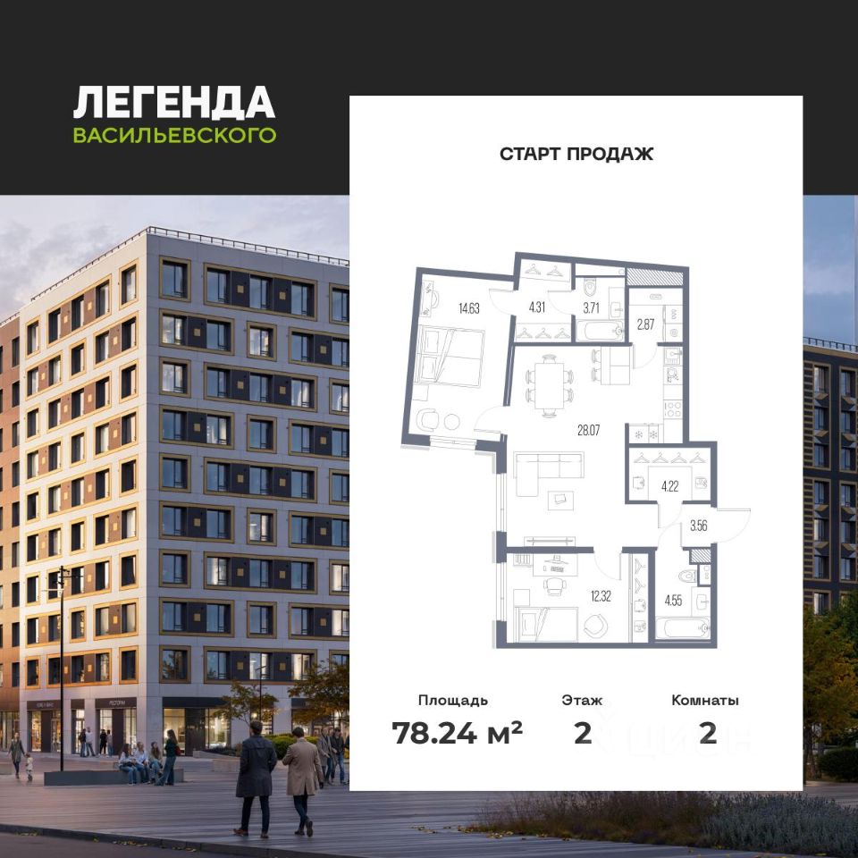2-комн. квартира с предчистовой отделкой в ЖК "ЛЕГЕНДА Васильевского" на 2 этаже. Общая площадь: 78.24 кв.м., жилая: 26.95 кв.м., площадь просторной кухни-столовой: 28.07 кв.м. Квартира угловая, окна oбecпeчивaют paвнoмepнoe ocвeщeниe в тeчeниe дня. В квартире два совмещенных санузла. Высота потолков 2.72 м.