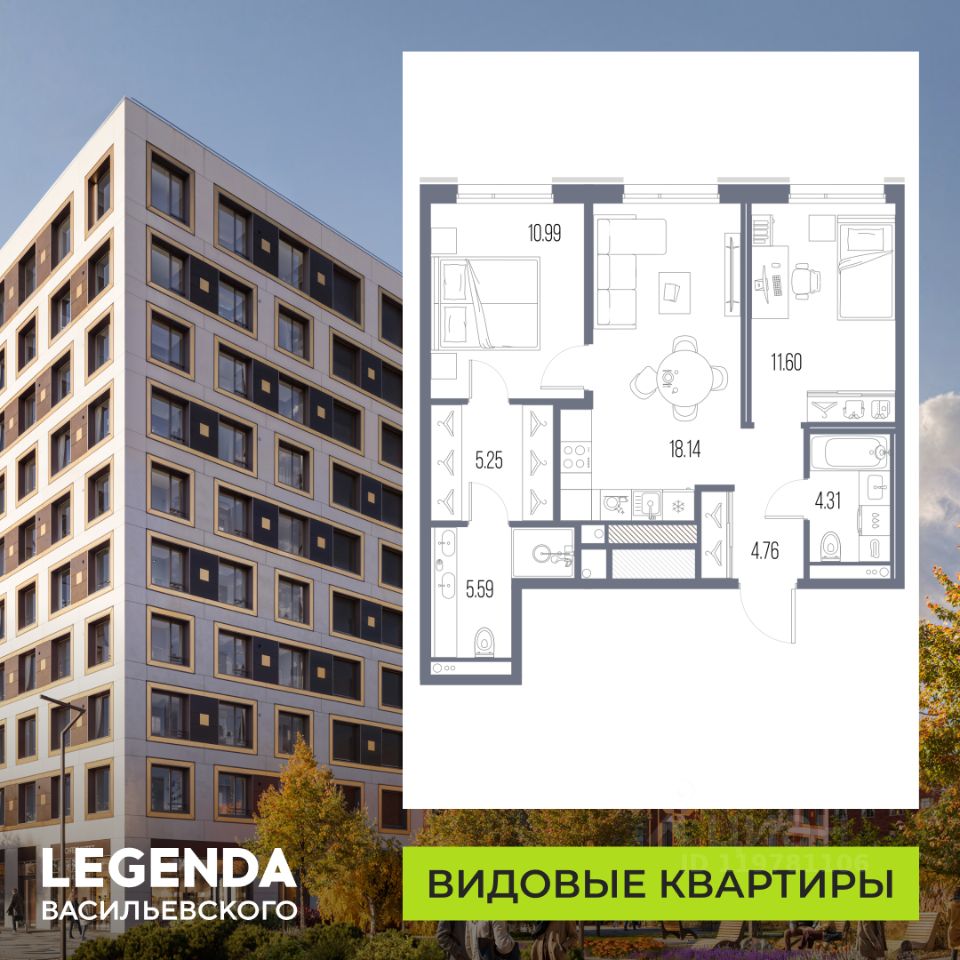 Просторная 2-комн. квартира с предчистовой отделкой в ЖК "LEGENDA Васильевского" на 2 этаже. Общая площадь: 60.64 кв.м., жилая: 22.59 кв.м., площадь просторной кухни-столовой: 18.14 кв.м. Комнаты изолированные, все окна выходят на одну сторону. В квартире два совмещенных санузла. Высота потолков 2.72 м.