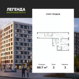3-комн. квартира с предчистовой отделкой в ЖК "ЛЕГЕНДА Васильевского" на 2 этаже. Общая площадь: 88.7 кв.м., жилая: 37.18 кв.м., площадь просторной кухни-столовой: 25.56 кв.м. Квартира - распашонка, без проходных комнат, окна выходят на paзные стороны дома. В квартире два совмещенных санузла. Высота потолков 2.72 м.