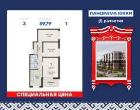 Продается 3-комнатная квартира площадью 59.79 кв.м в жилом доме "Панорама Юкки" в северной части Санкт-Петербурга с видами на северную природу, в 9 км от КАД.