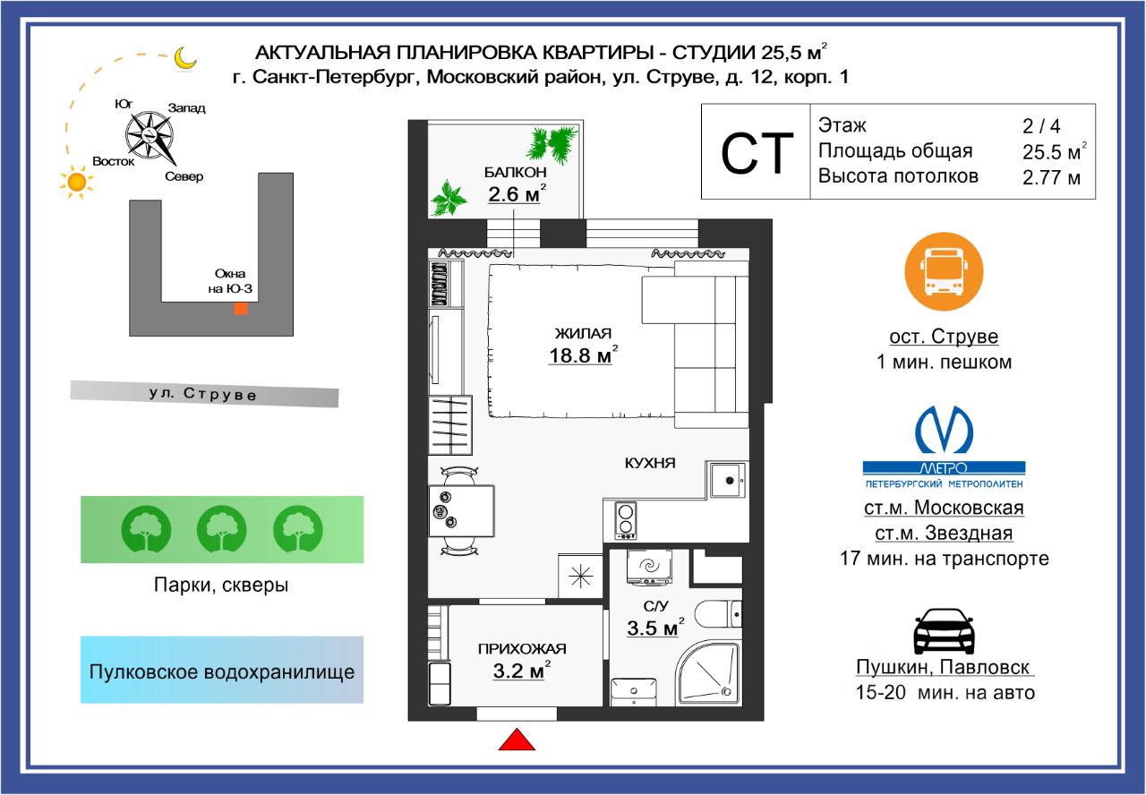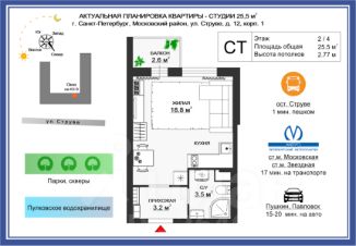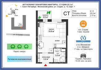 Рассмотрите для покупки просторную и уютную студию в одном из самых зелёных и спокойных уголков Московского района Санкт-Петербурга.