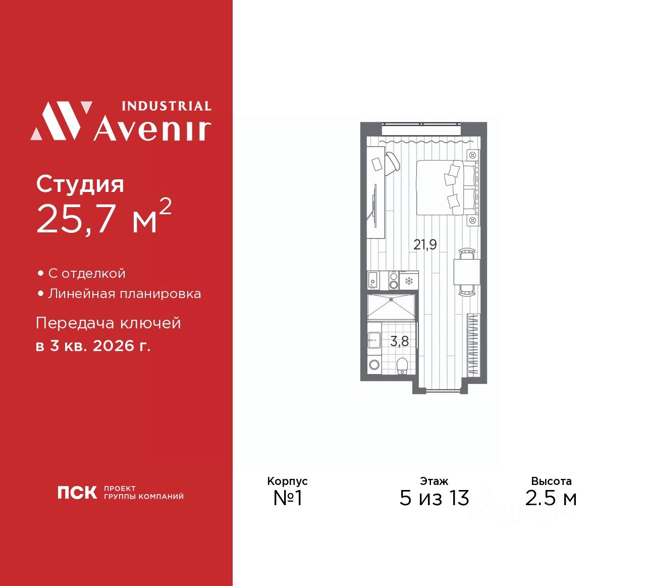1-комн. апартаменты-студия с отделкой в ЖК "Industrial AVENIR" на 5 этаже. Общая площадь: 25.7 кв.м., площадь гостиной 21.9 кв.м., из которых 5 кв.м. выделено под кухонную зону. Все окна выходят на одну сторону. В апартаментах один совмещенный санузел. Высота потолков 2.5 м.