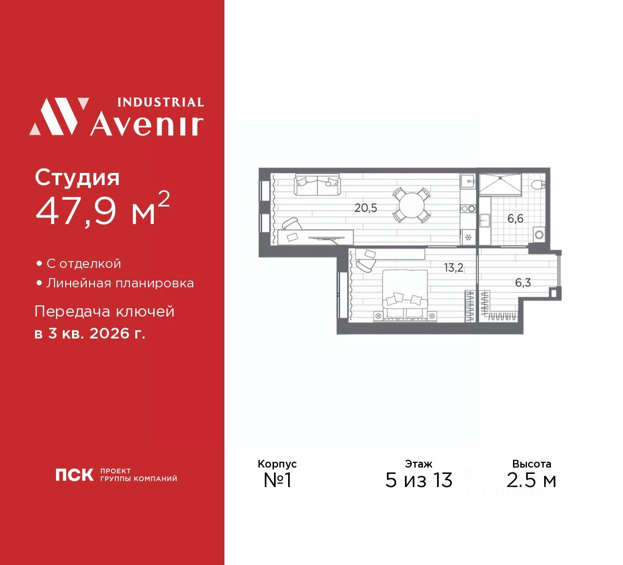 Продаются двухкомнатные апартаменты с европланировкой и отделкой в ЖК "Industrial AVENIR" на 5 этаже. Общая площадь: 47.9 кв.м., жилая: 28.7 кв.м., общая площадь гостиной-столовой с кухонной зоной: 20.5 кв.м. Европейская планировка, кухня-гостиная - идеальный вариант для тех, кто любит часто принимать гостей. Комнаты изолированные, все окна выходят на одну сторону. В апартаментах один совмещенный санузел. Высота потолков 2.5 м.
