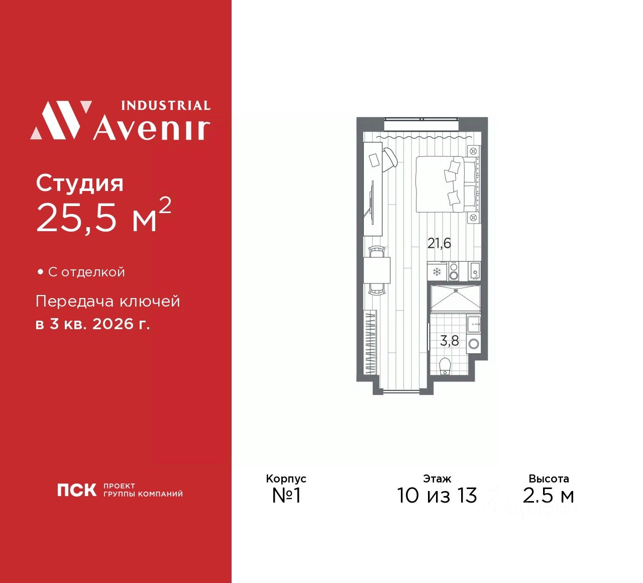 1-комн. апартаменты-студия от застройщика с отделкой в ЖК "Industrial AVENIR" на 10 этаже. Общая площадь: 25.5 кв.м., площадь гостиной 21.6 кв.м., из которых 5 кв.м. выделено под кухонную зону. Все окна выходят на одну сторону. В апартаментах один совмещенный санузел. Высота потолков 2.5 м.