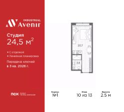 Продаются 1-комн. апартаменты-студия с отделкой в ЖК "Industrial AVENIR" на 10 этаже. Общая площадь: 24.5 кв.м., площадь гостиной 20.7 кв.м., из которых 5 кв.м. выделено под кухонную зону. Все окна выходят на одну сторону. В апартаментах один совмещенный санузел. Высота потолков 2.5 м.